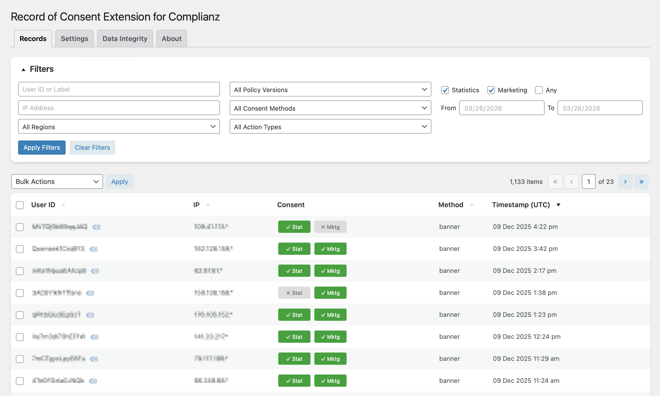 - Consent records will be stored automatically when Complianz triggers consent events.