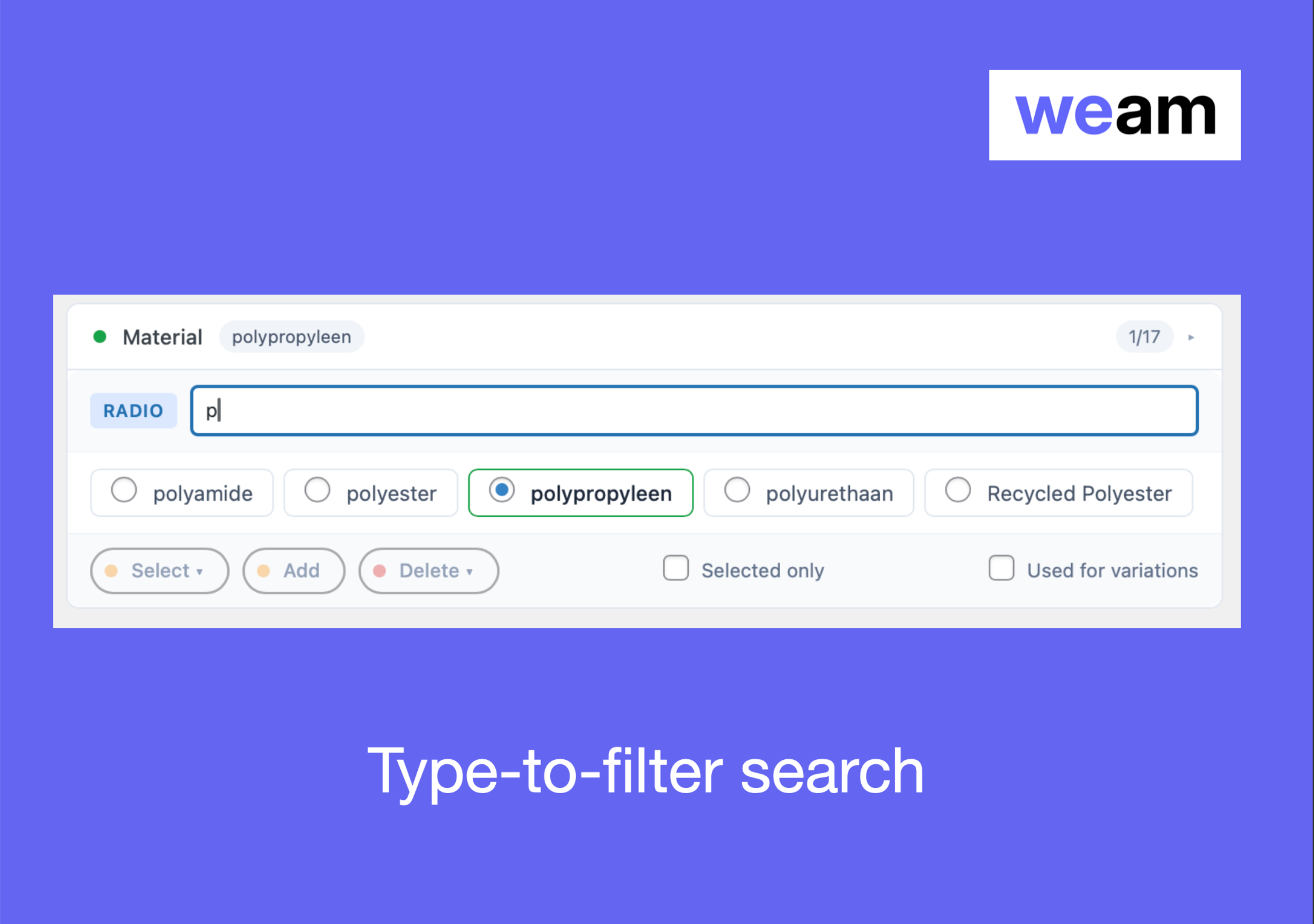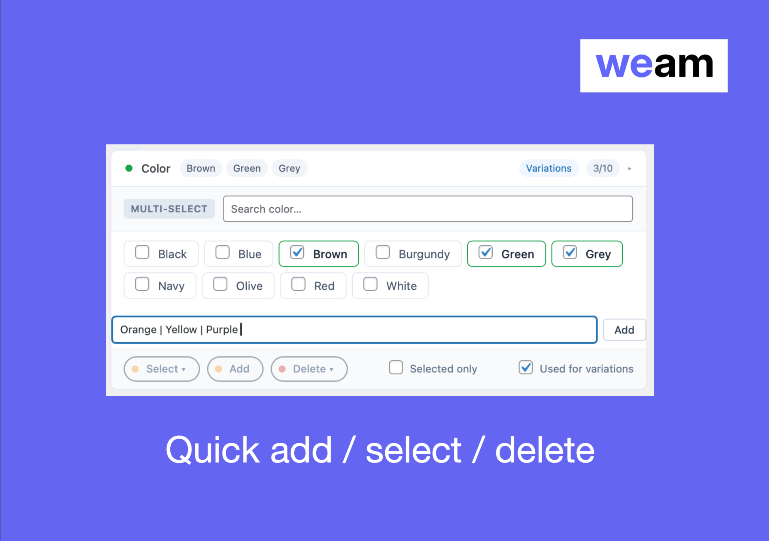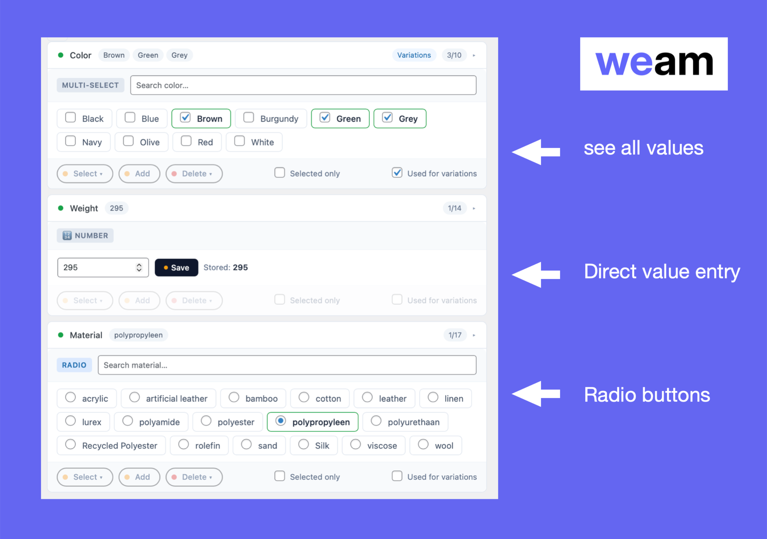 • Quick Add Values: Type cotton | wool | silk and WEAM creates all three at once. No page reloads.