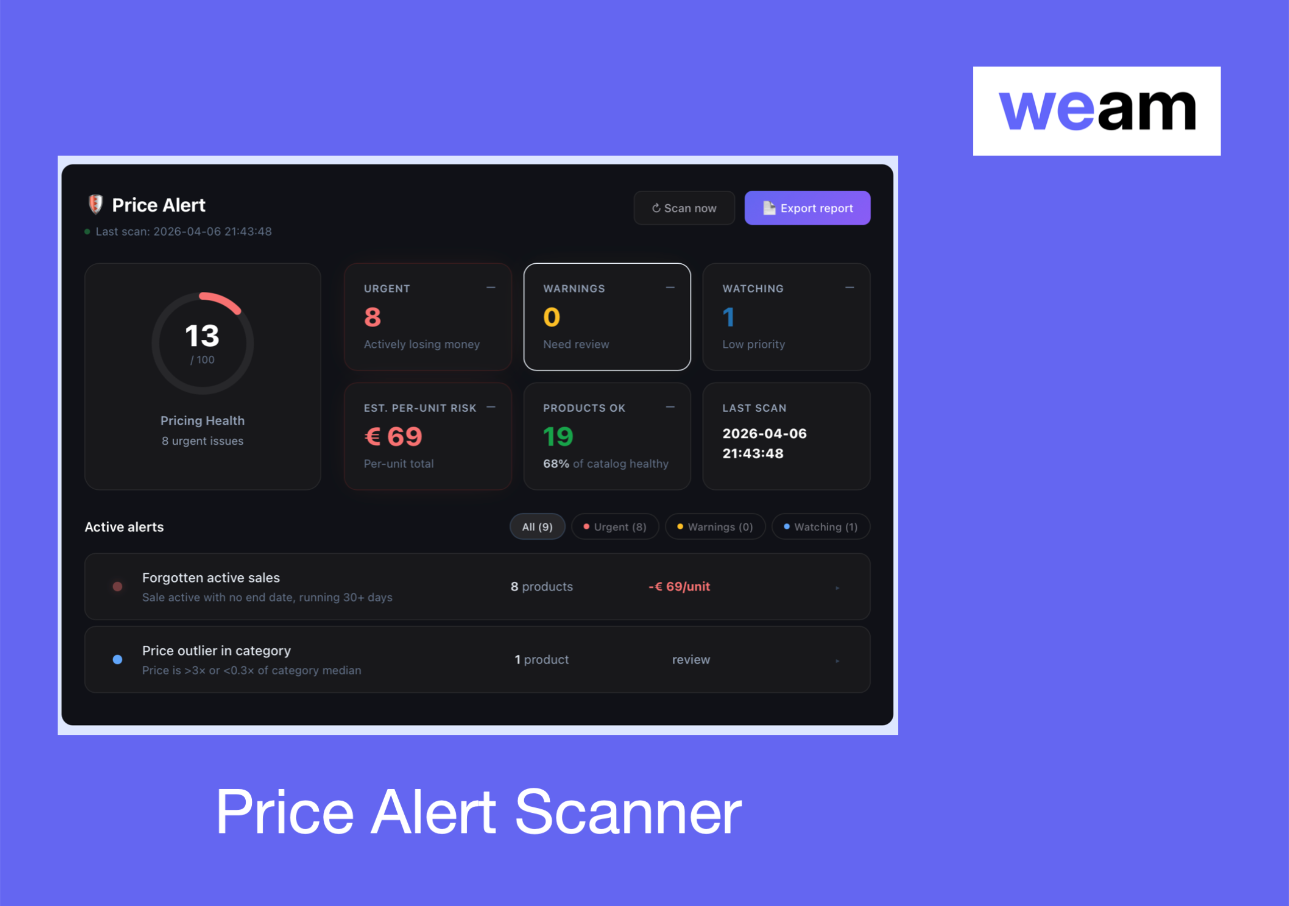 • Price Alerts [Pro]: 10 automated pricing health checks with trend tracking and email reports.