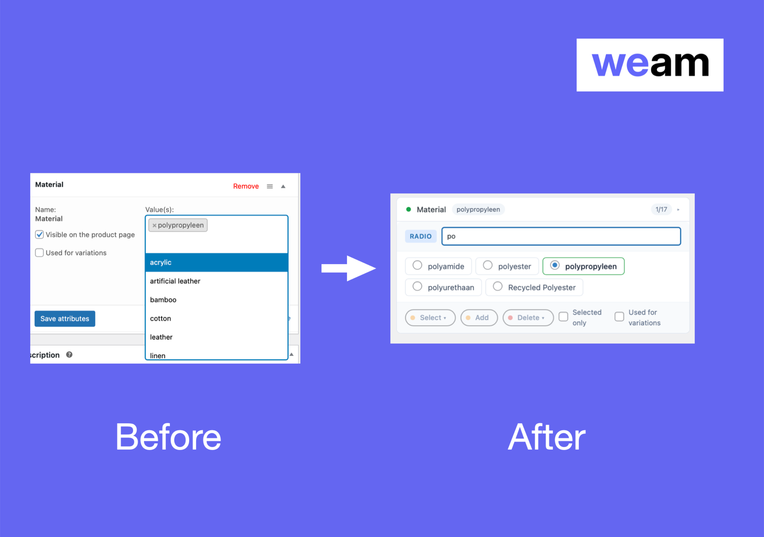 • Before & After — WooCommerce default dropdown vs WEAM’s radio buttons with instant search