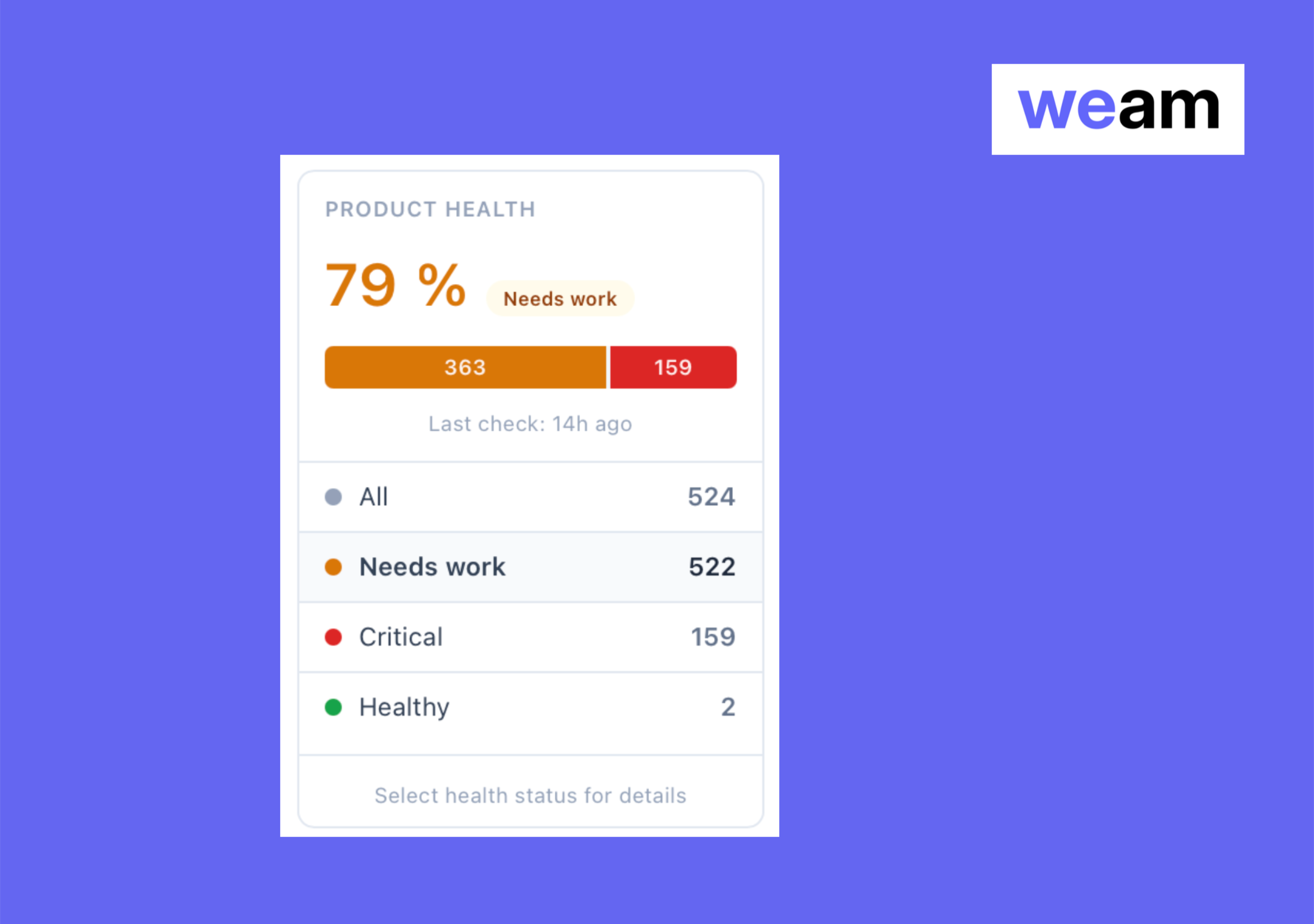 • Product Health — Live health score per product with severity breakdown and check categories